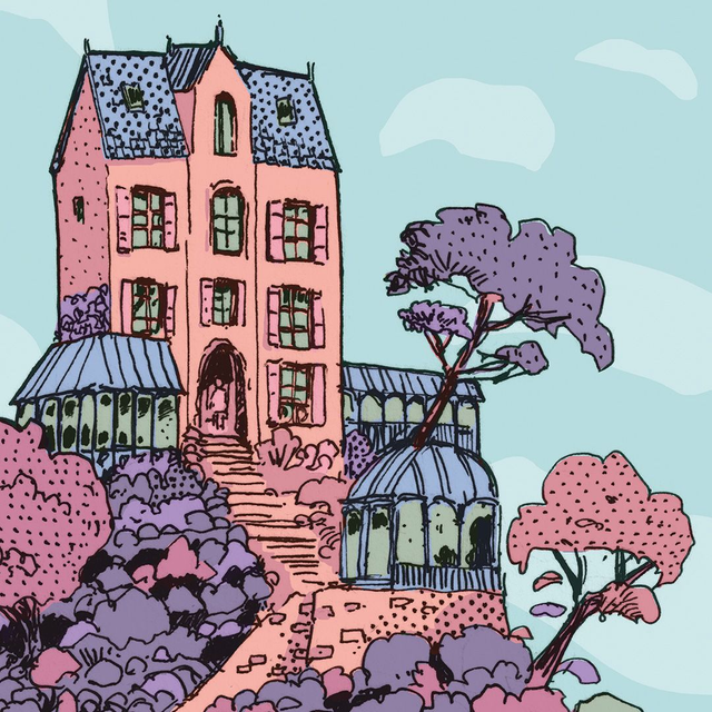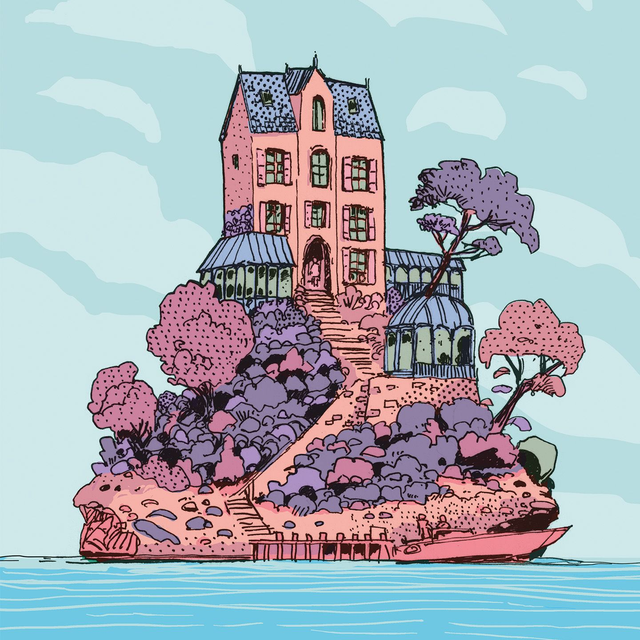 Encrage sur papier et colorisation numérique. Dessin d'une petite île surmontée d'une habitation