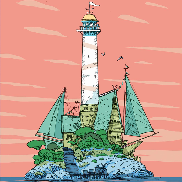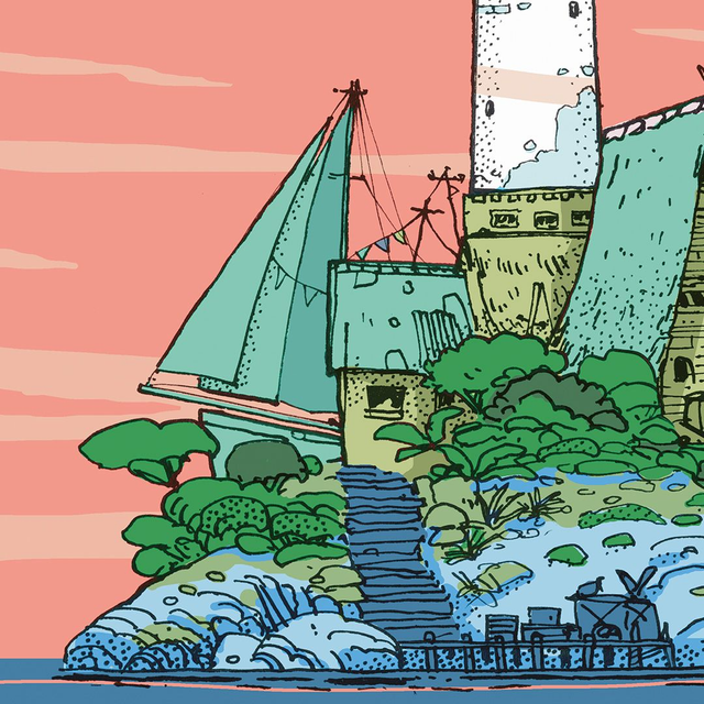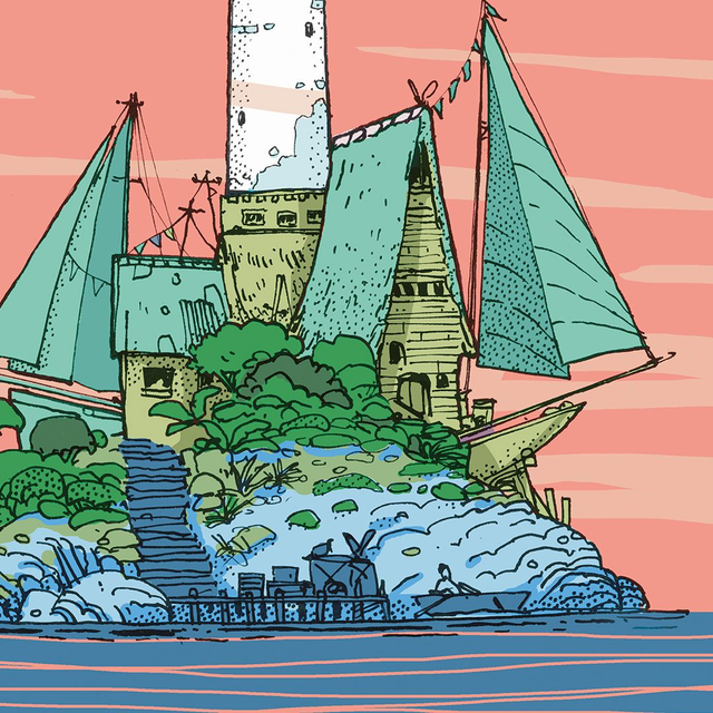 Encrage sur papier et colorisation numérique. Dessin d'une petite île surmontée d'une habitation