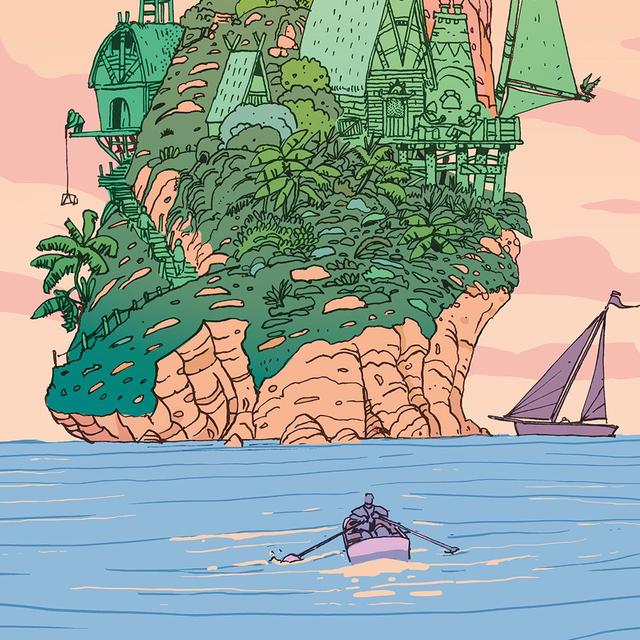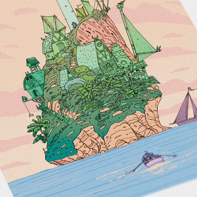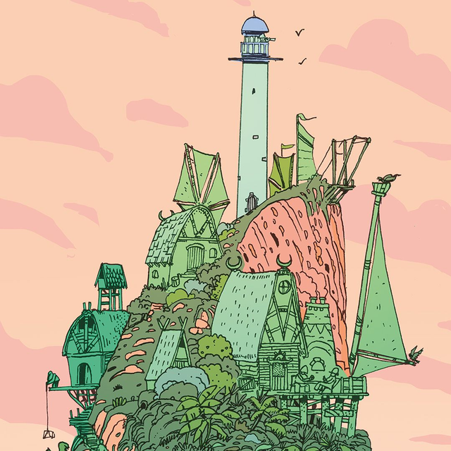 Dessin d'une petite île imaginaire surmontée d'un phare et d'un village